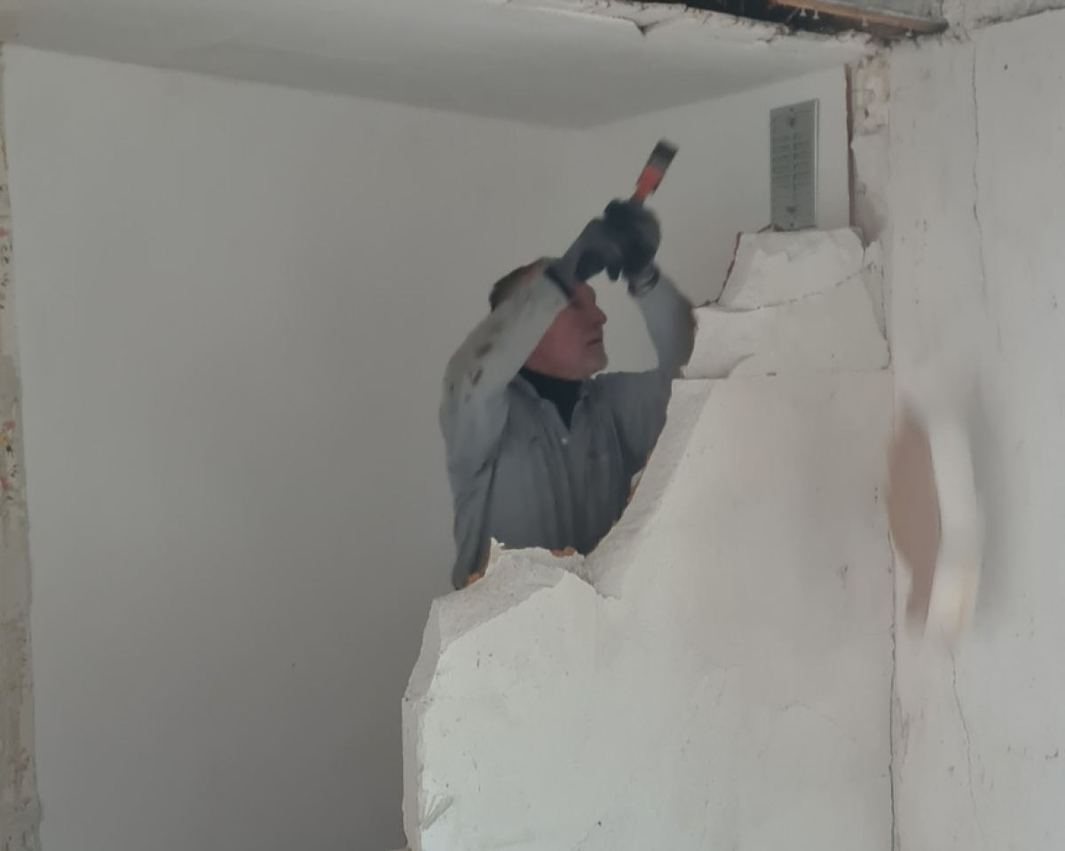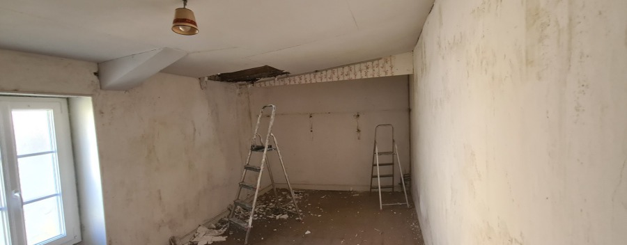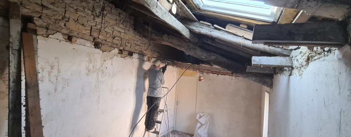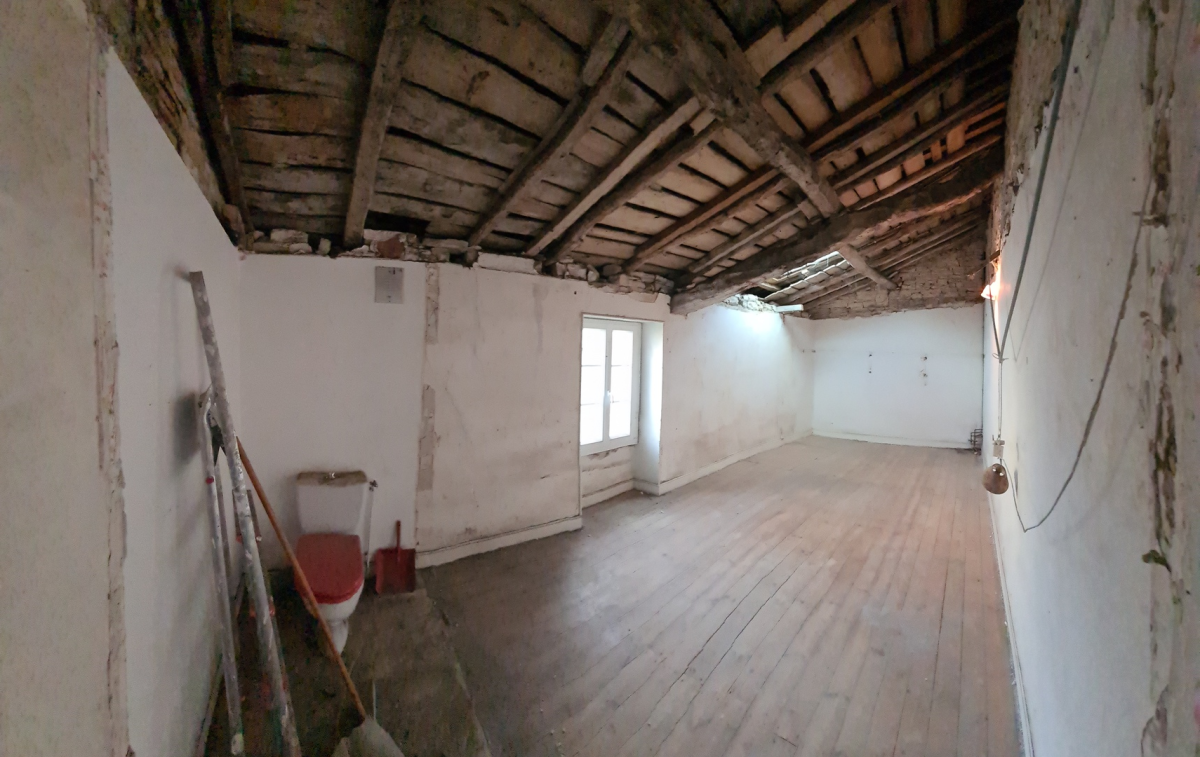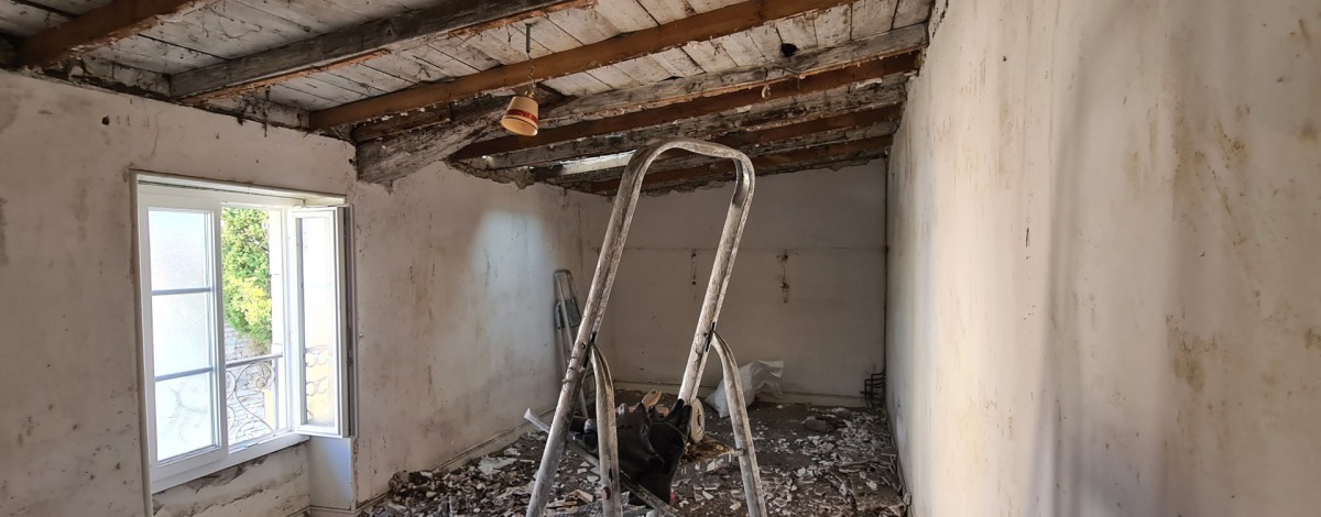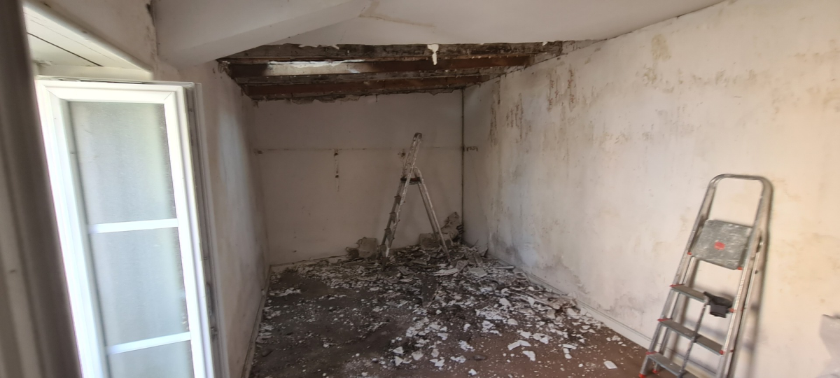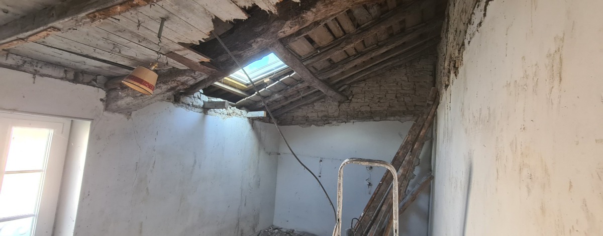 Alors on supprime la cloison qui séparait les toilettes et on fait tomber le plafond afin de déterminer la véritable hauteur dont on dispose ! .