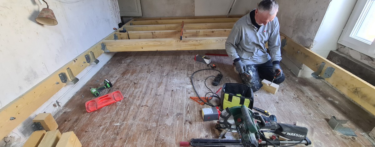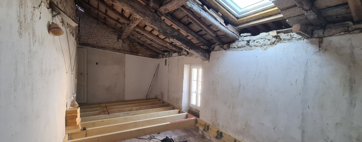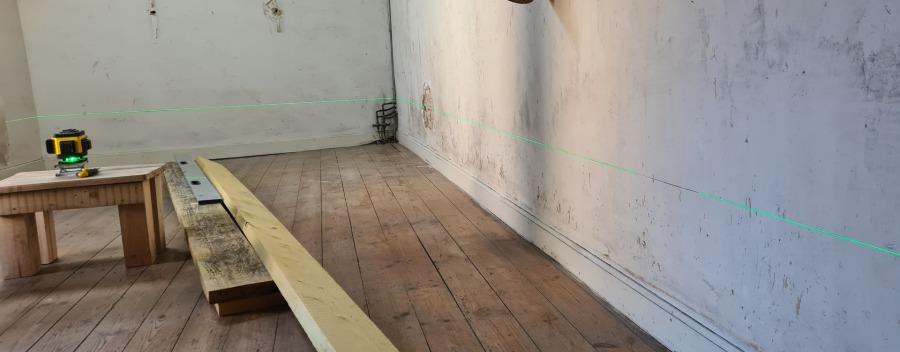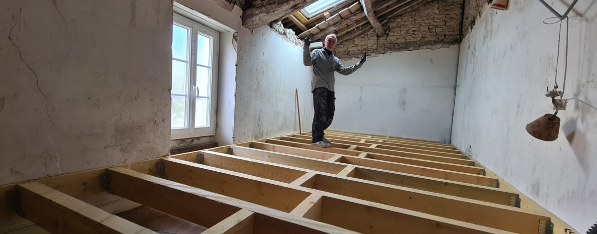Après quelques mesures une fois place nette, la décision est prise de re-construire un plancher corrigeant le niveau