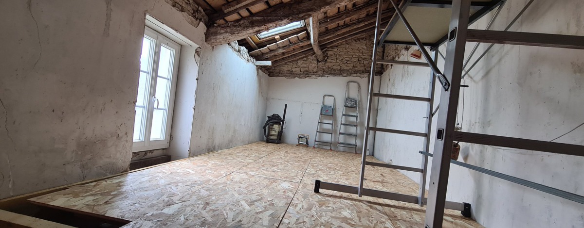 Ce qui nous chagrinait était les deux marches à descendre pour y accéder et un plancher tordu en pente de 8cm sur la longueur de la pièce...