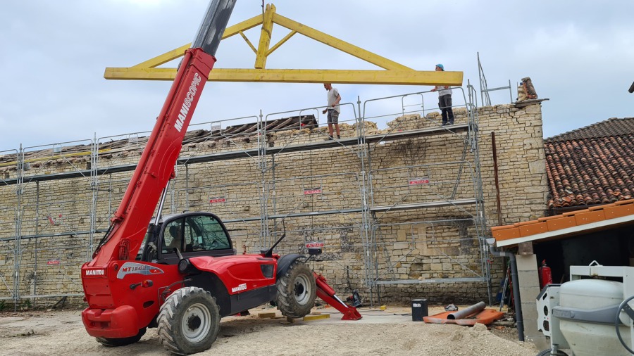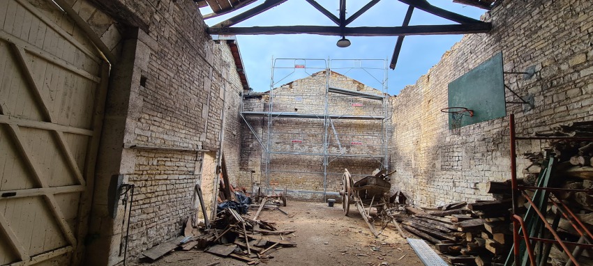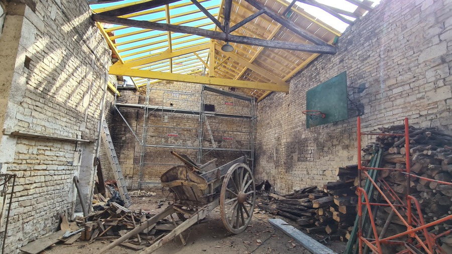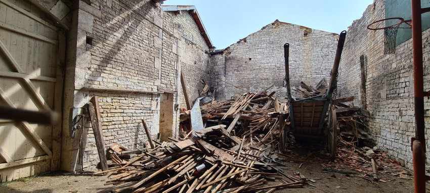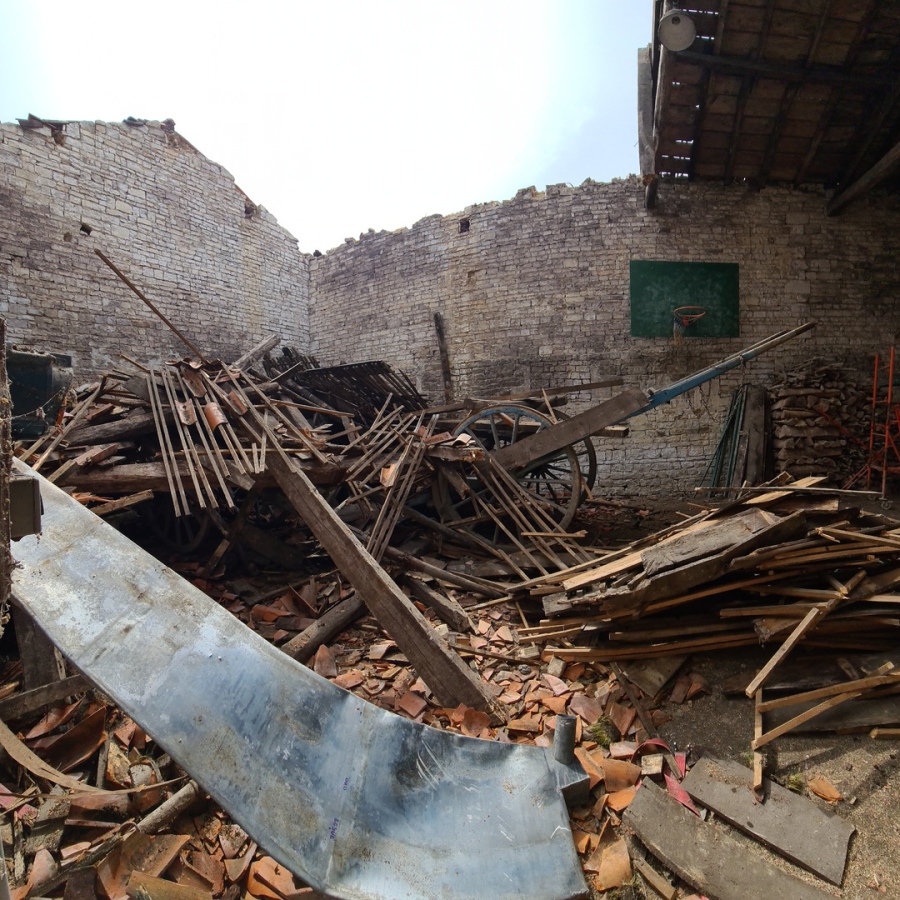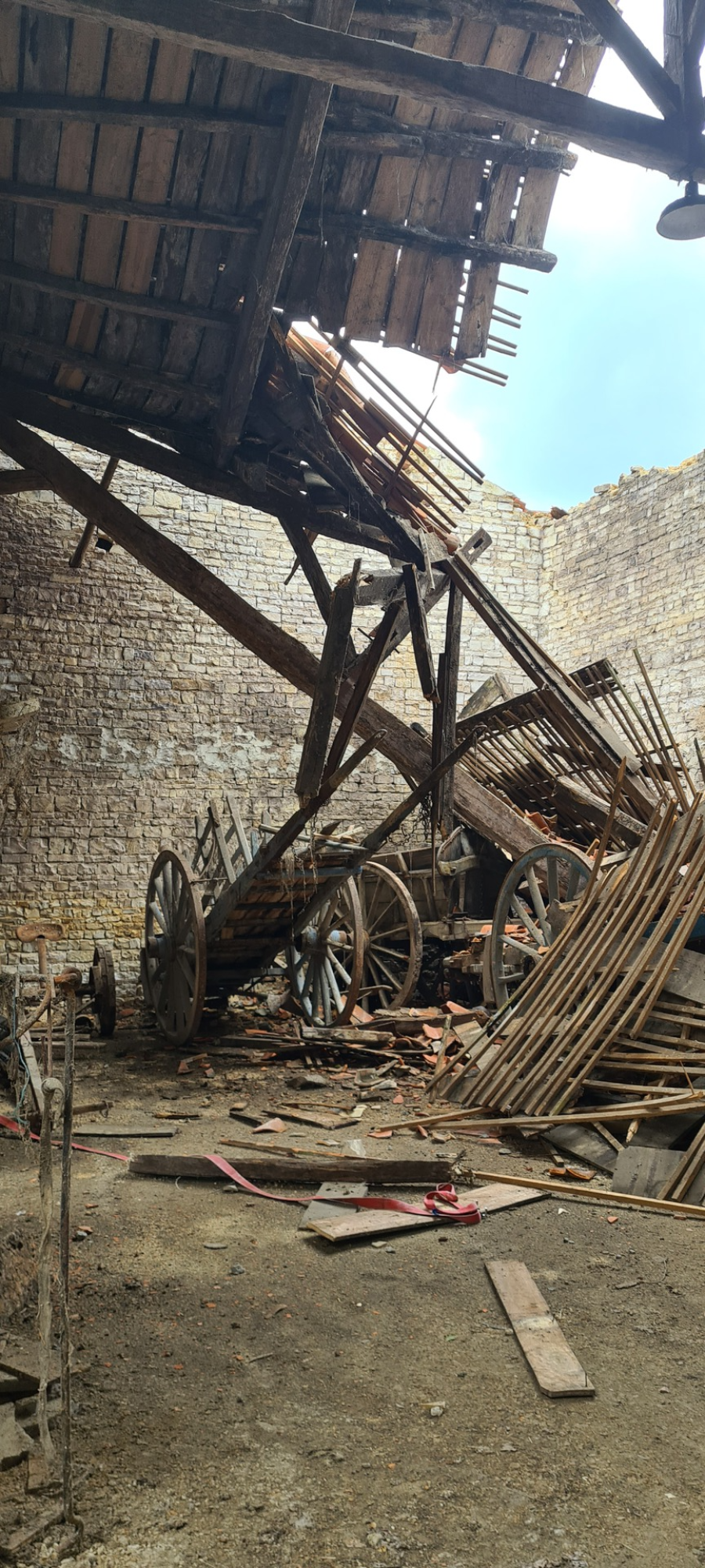 On le savait...la toiture au dessus de la grange "aux charettes" était très mal en point et tenait depuis longtemps encore debout avec des étais...
