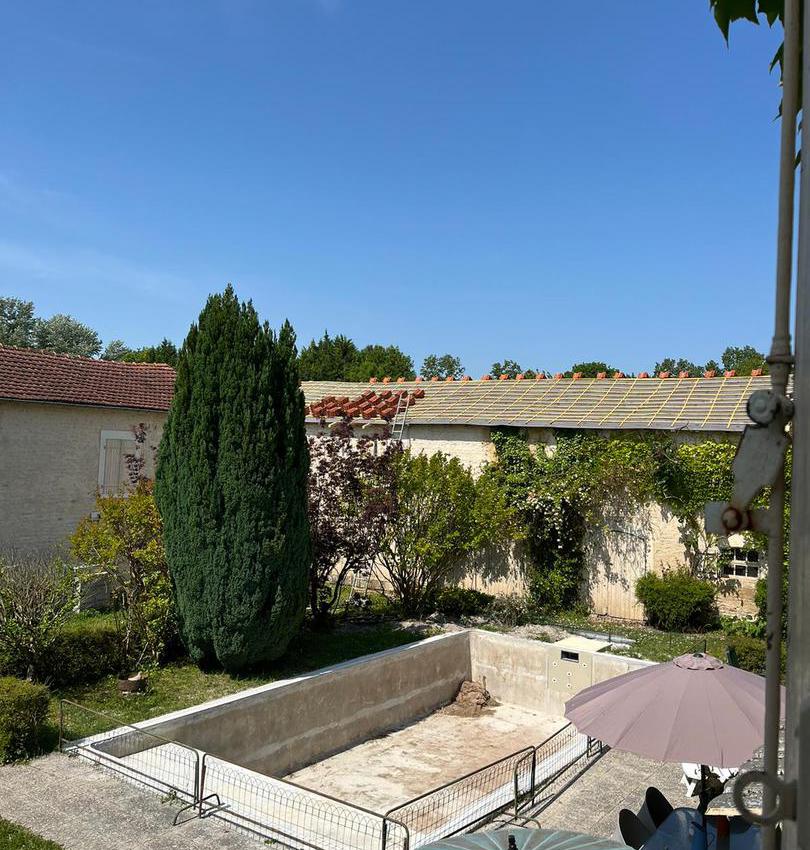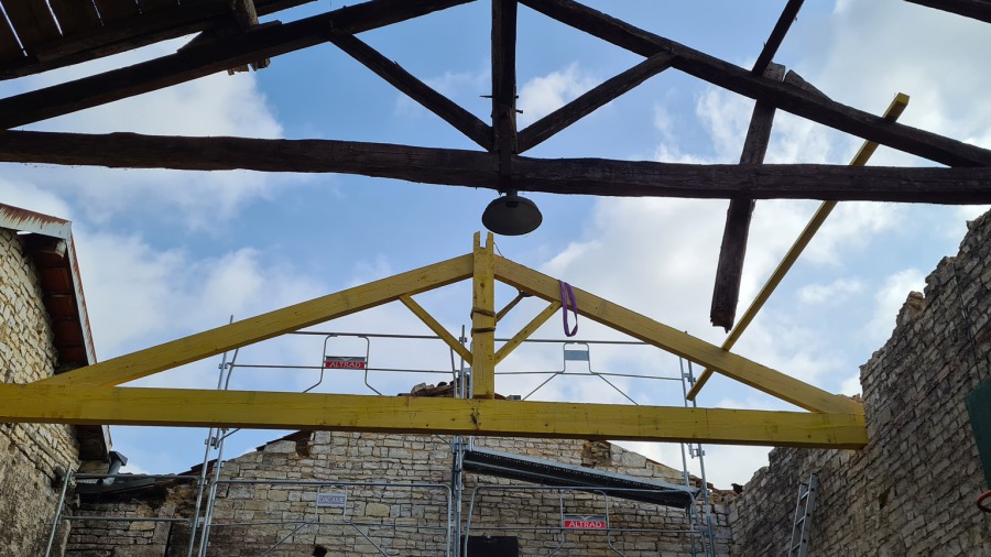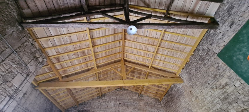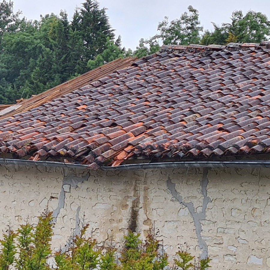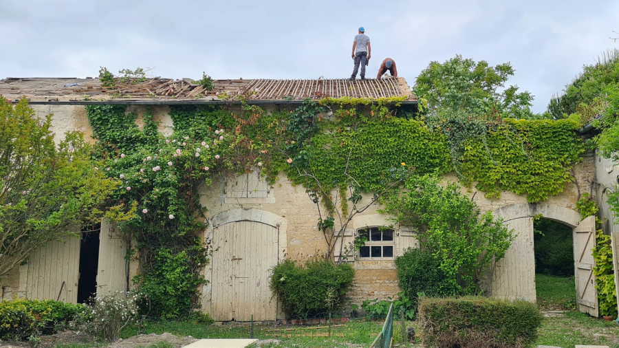On a prié pour qu'elle tienne le coup jusqu'aux réparations, mais elle n'a pas eu cette patience et l'entrait qui avait pourri dans le mur à la faveur d'années d'infiltrations a fini par casser dans les premiers jour de mai entrainant une partie de la toiture avec la charpente ...